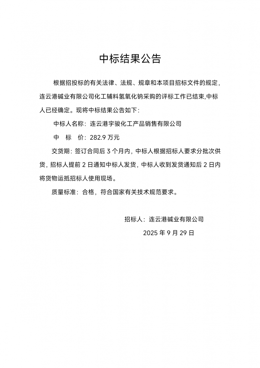 连云港碱业有限公司化工辅料氢氧化钠采购中标结果公告