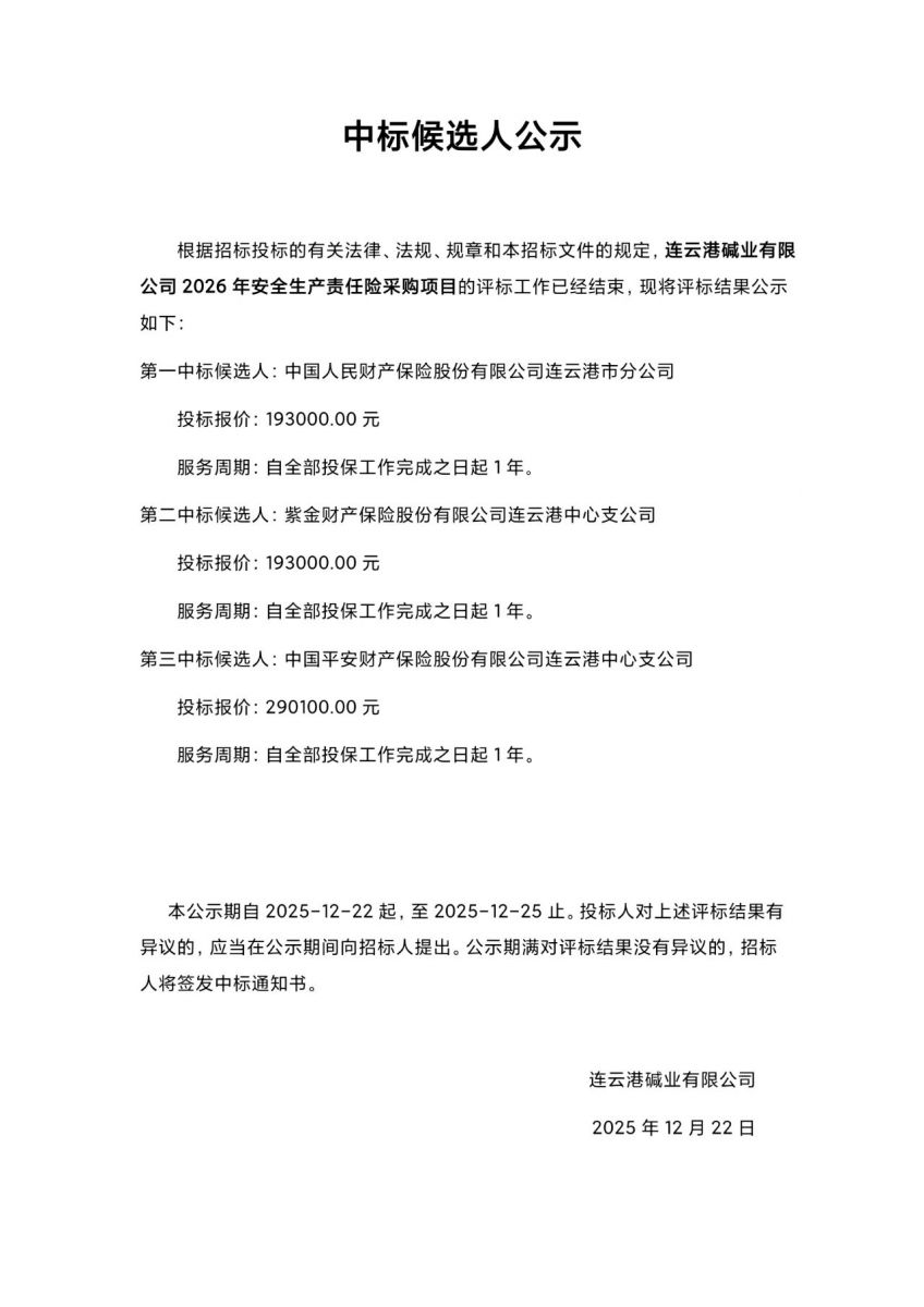 连云港碱业有限公司2026年安全生产责任险采购项目中标候选人公示