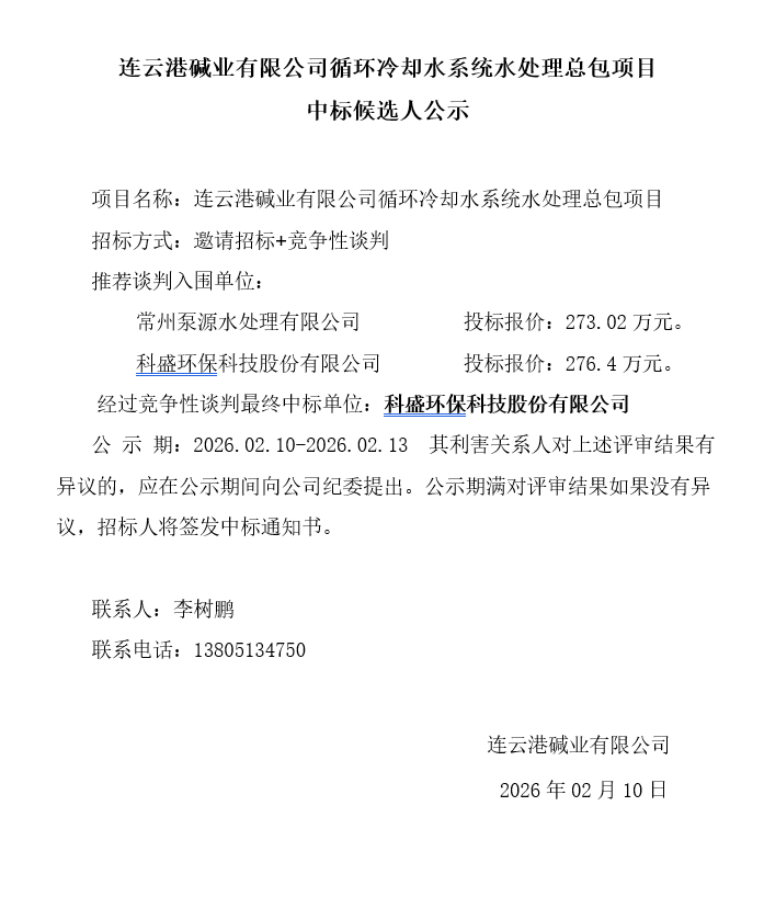 连云港碱业有限公司循环冷却水系统水处理总包项目中标候选人公示