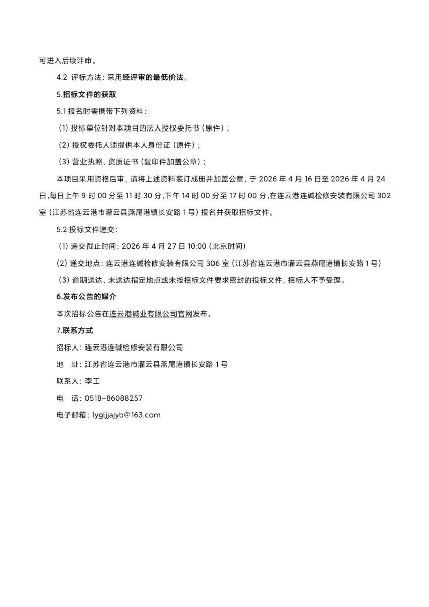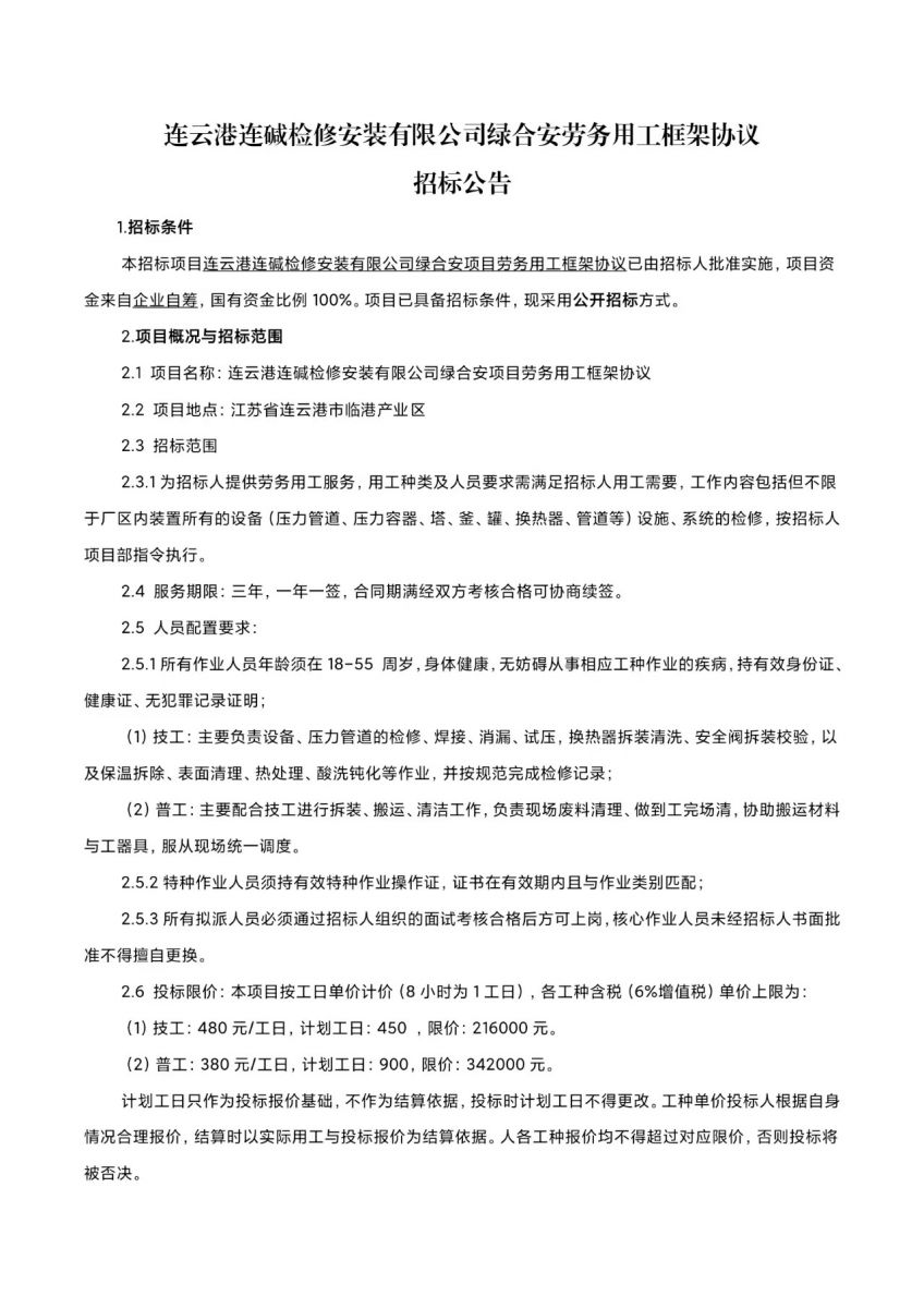 连云港连碱检修安装有限公司绿合安劳务用工框架协议招标公告