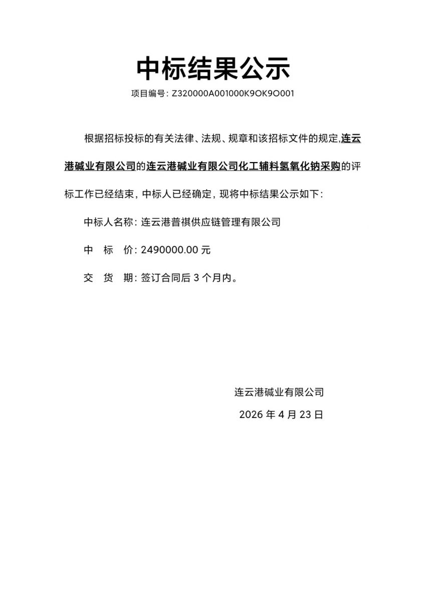 连云港碱业有限公司化工辅料氢氧化钠采购中标结果公示