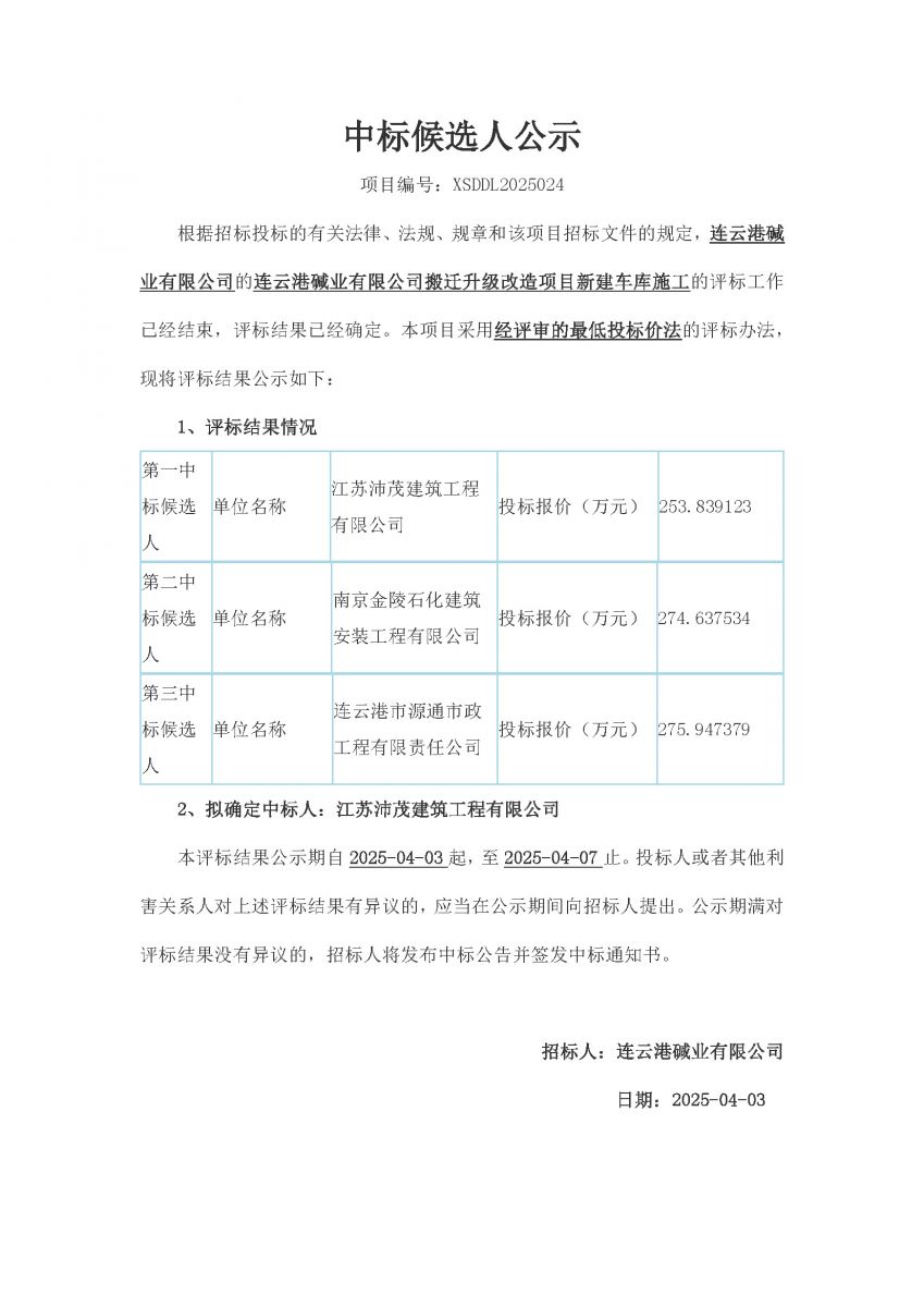 新建车库施工中标候选人公示